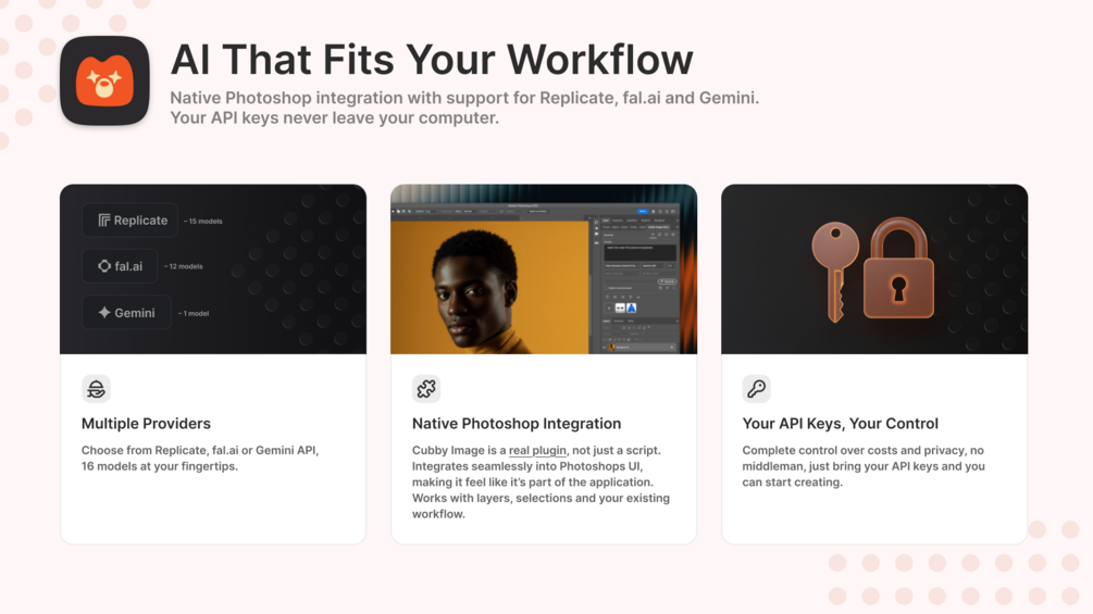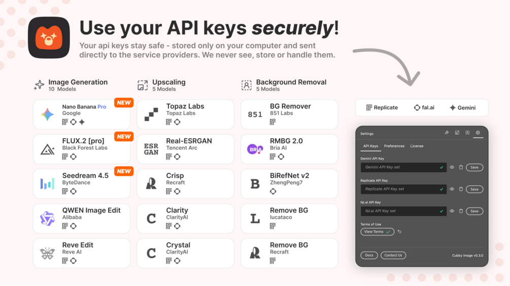 Cubby Image integrates seamlessly with Replicate's API, Googleβs Gemini API and fal.ai's API, giving you access to 20 AI models (check the full list here). For example: