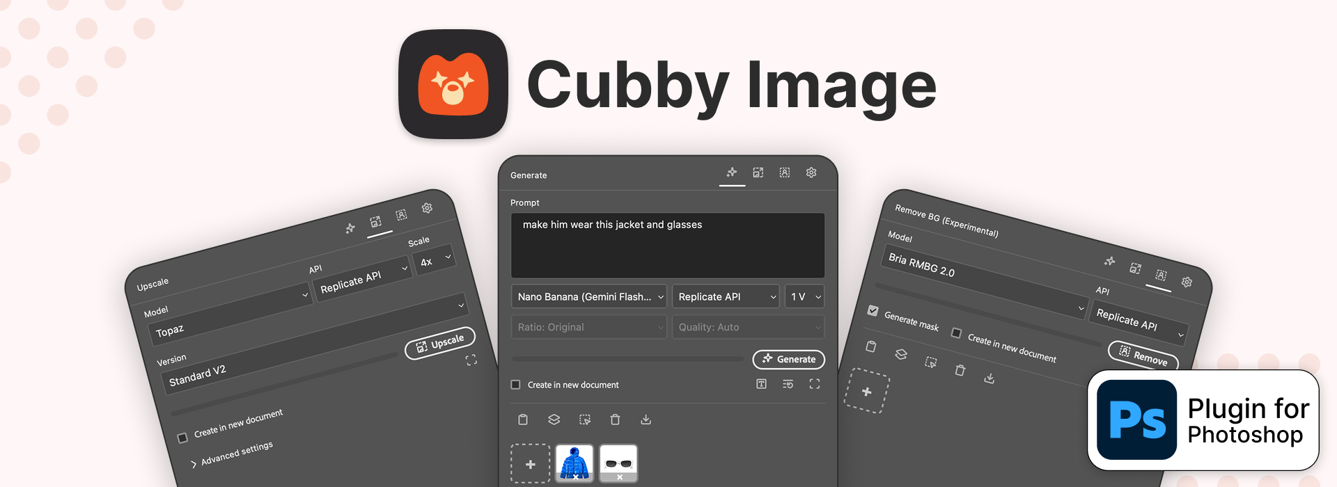 Cubby Image for Photoshop β The Most Powerful Plugin for AI Image Editing, Upscaling & Background Removal (Nano Banana Pro, FLUX.2, Seedream 4.5, Topaz & many more)