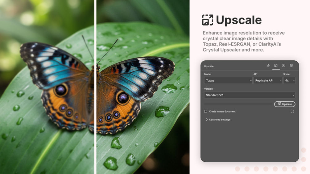- Upscaling β Enhance resolution and image quality without leaving Photoshop.